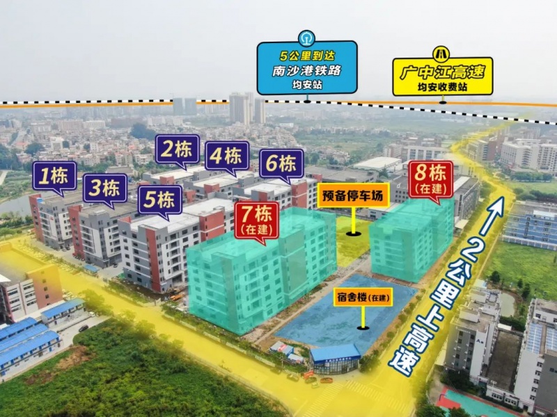 7#栋、8#栋厂房是以5#栋、6#栋厂房为建设标准,【打造前瞻性产品设计】——首层7.5米,2-3层5米,承重1吨,配套2台5吨货梯及2台2吨客货梯辅助货运,1200㎡大平层正好满足中小型轻装备加工企业完成生产-加工-仓储-办公等全方面一体,灵活实用度超高。